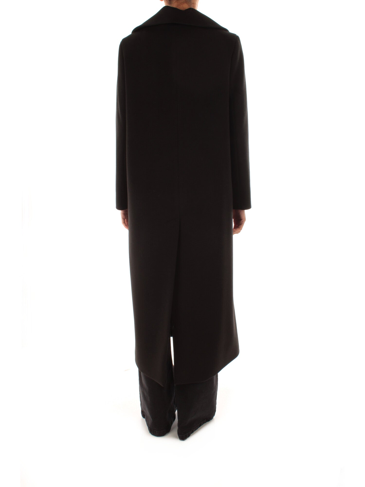 Cappotto lungo in panno double con tasche a filo e chiusura doppiopetto con un bottone. Altezza modella: 170 cm. Taglia indossata: 40. 75% poliestere, 20% viscosa, 5% elastan