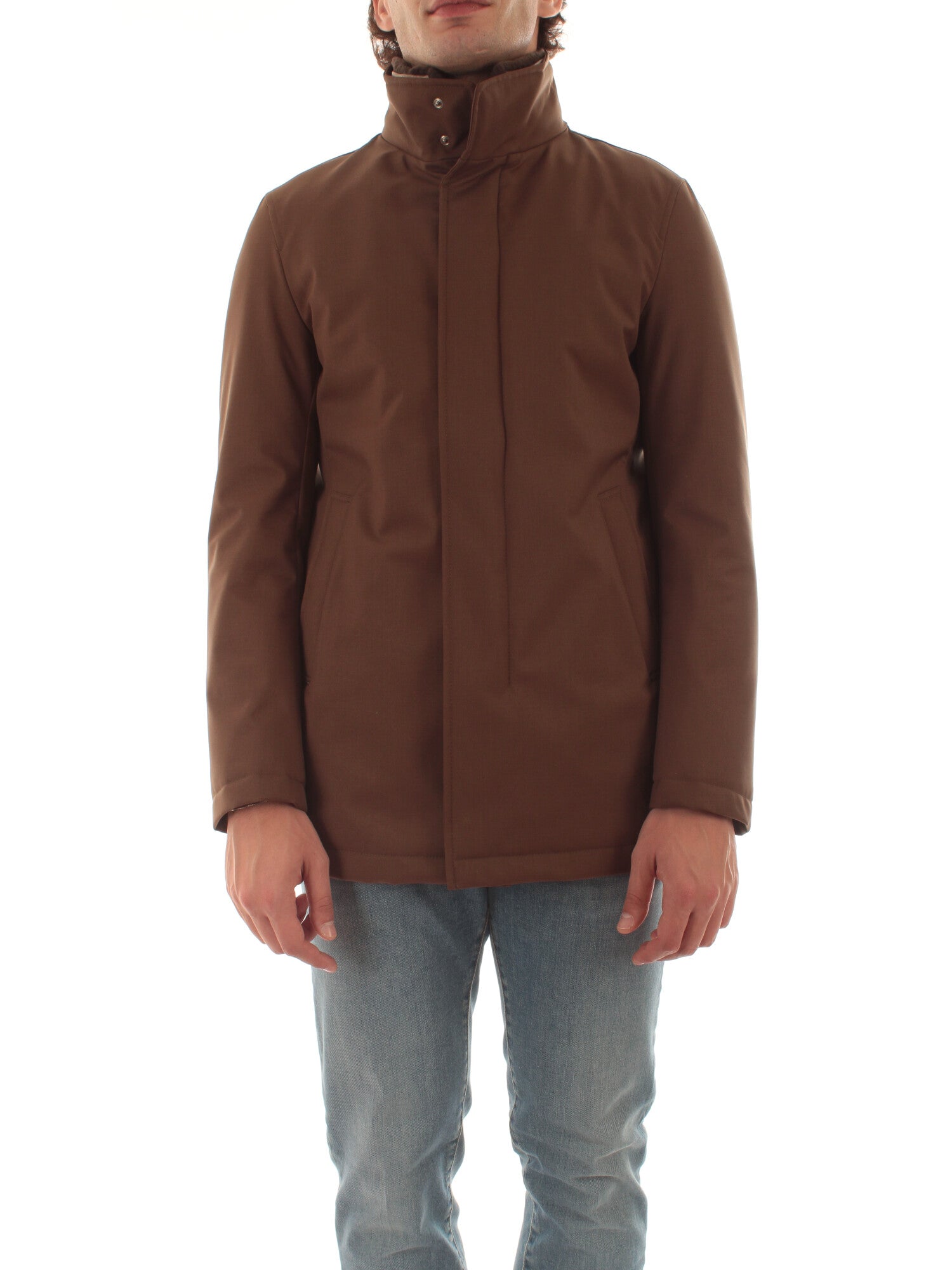 Carcoat in twill di poliestere dall’aspetto laniero mélange. Il tessuto è rifinito con una membrana che offre resistenza all'acqua e al vento. Imbottitura in ovatta. Collo alto rifinito in faux fur. Tasche laterali. Logo Herno in metallo sul retro. Chiusura con zip e bottoni a pressione. Altezza modello: 185 cm. Taglia indossata: 48. 100% poliestere