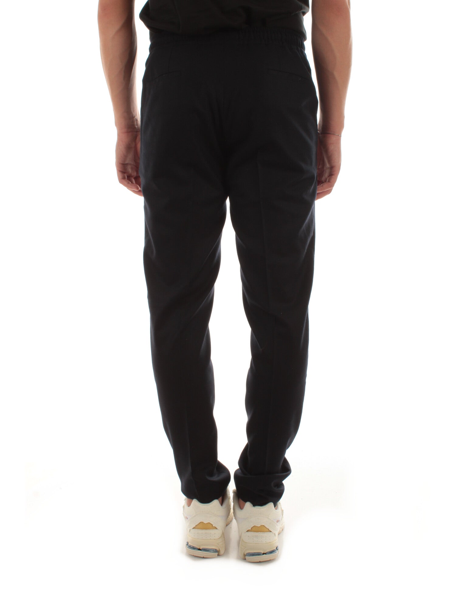 Pantalone in panno di lana. Elastico in vita sul retro. Tasche laterali e chiusura centrale con zip. Altezza modello: 185 cm. Taglia indossata: 50. 95% lana, 4% poliammide, 1% elastan