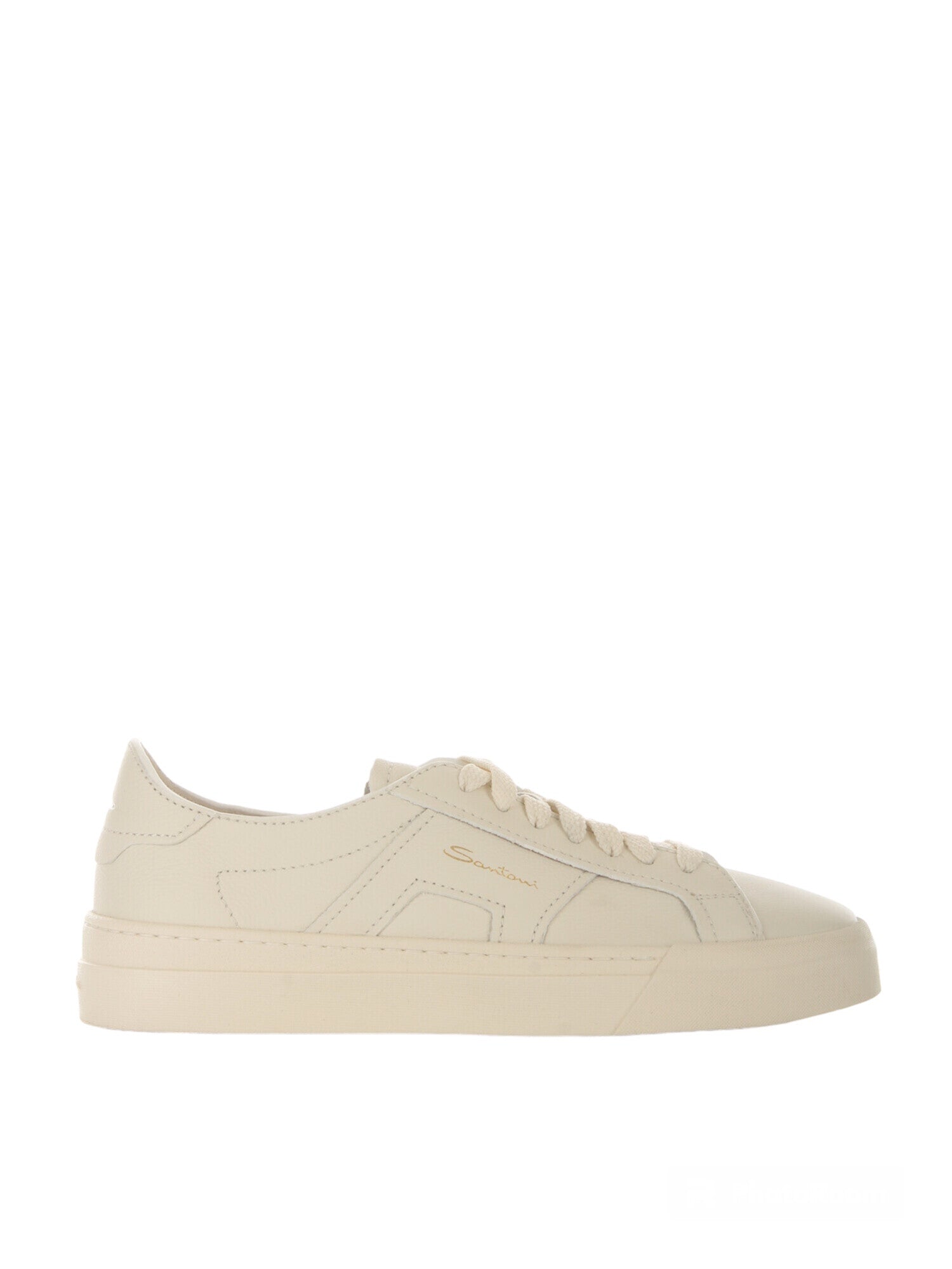 Sneakers low top in pelle martellata con suola a cassetta in gomma. Tomaia in pelle decorata con inserto a forma di doppia fibbia sui lati e dettaglio in pelle logata sulla linguetta e sul tallone. Forma ampia e punta arrotondata. Chiusura con lacci. Lettering Santoni inciso sul battistrada. Made in Italy. Altezza suola: 4 cm. 100% pelle