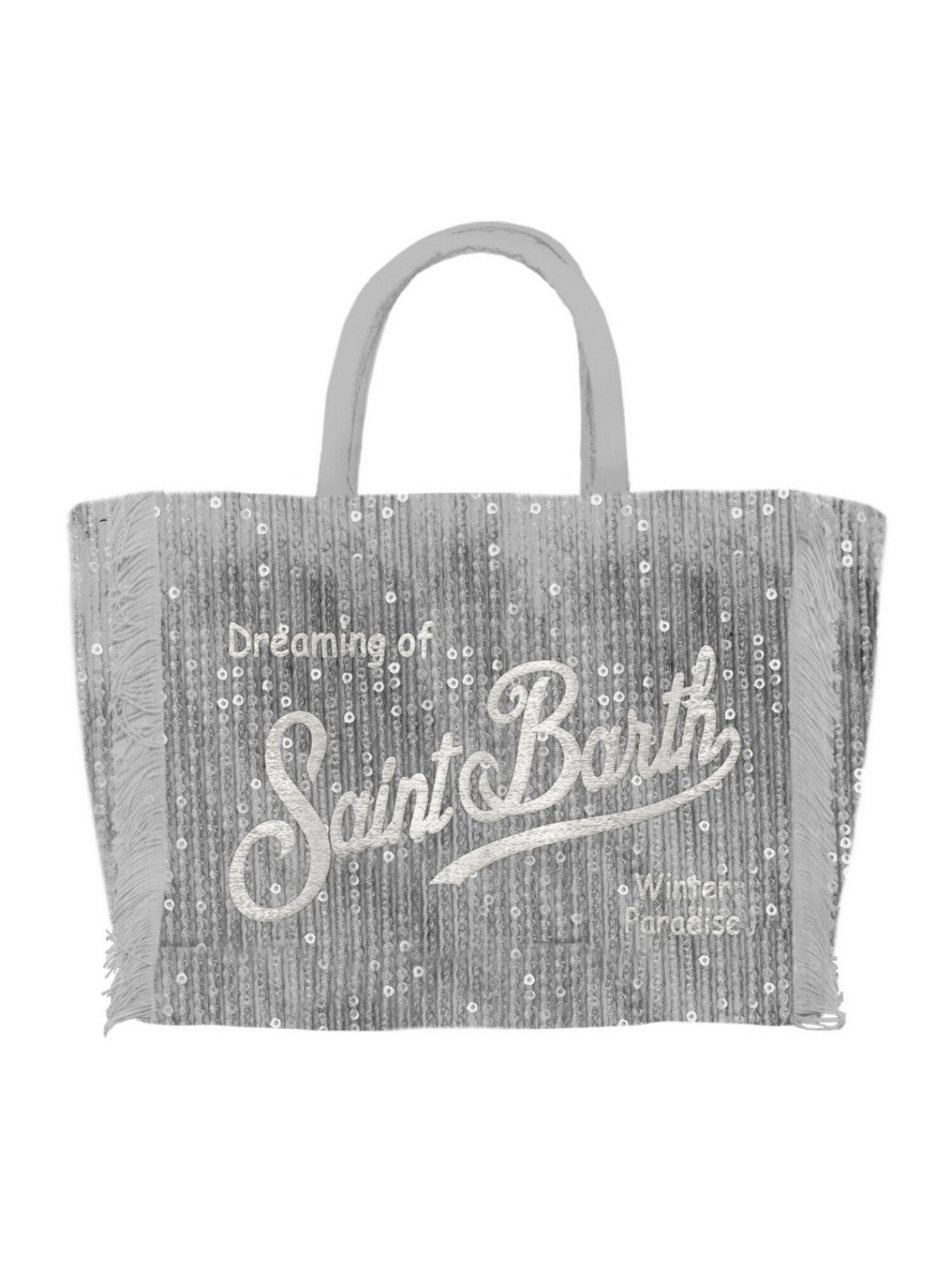 Borsa in velluto con ricamo all-over di paillettes in tono. Logo St.Barth ricamato. Chiusura con zip. Doppi manici. Tracolla removibile. Orli sfrangiati. 21 x 18 x 10 cm. 100% poliestere