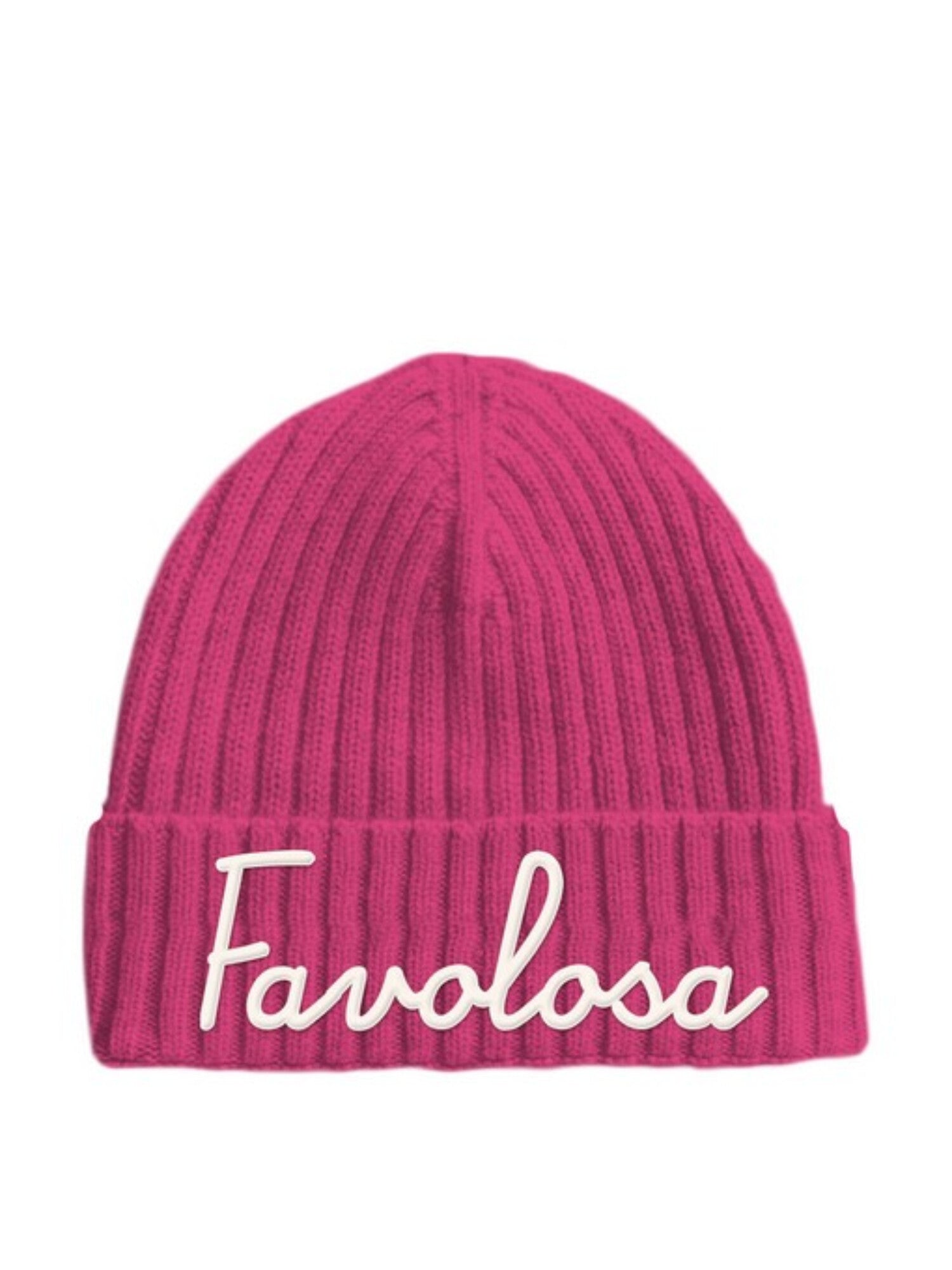 Berretto con lavorazione a costine e ricamo frontale. 22x20 cm. 40% Lana, 25% Nylon, 25% Viscosa, 10% Cashmere.