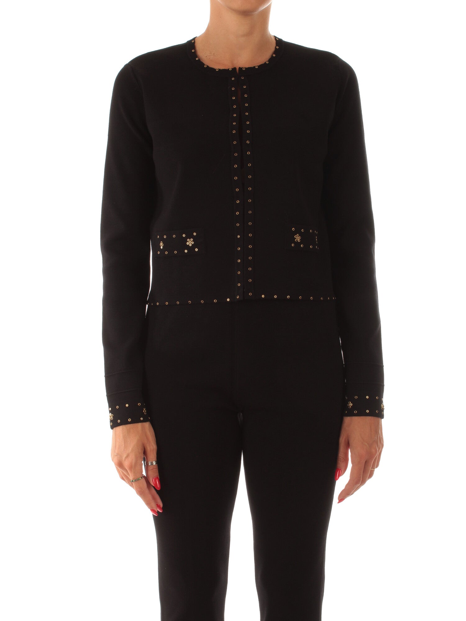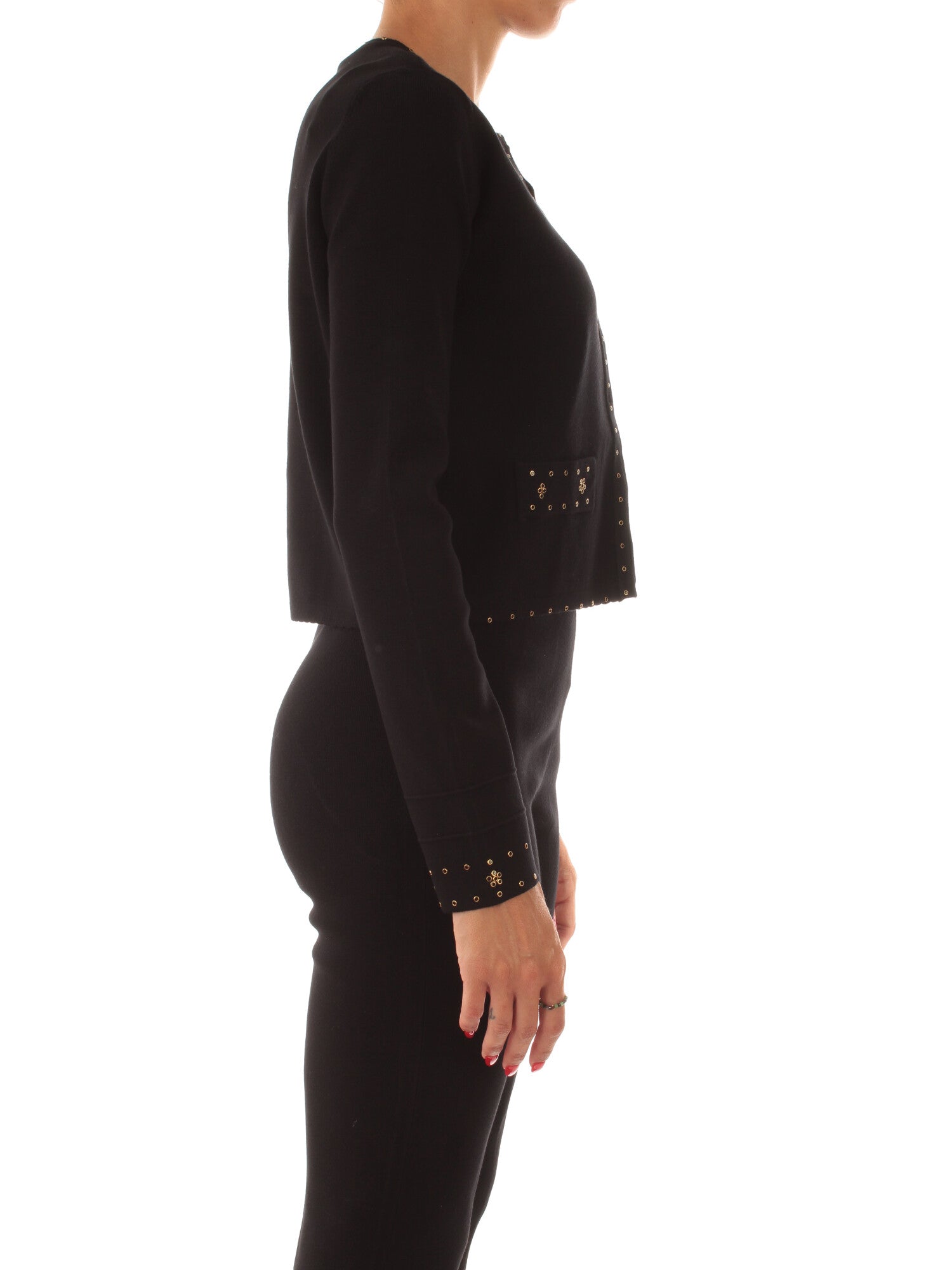 Giacca in maglia di viscosa stretch con dettagli rifiniti da applicazione di borchie strass. Ha lavorazione rasata, collo tondo, maniche lunghe, chiusura combaciata con uncinelli, linea morbida. Altezza modella: 172 cm. Taglia indossata: S. 60% viscosa 26% poliestere 14% poliammide