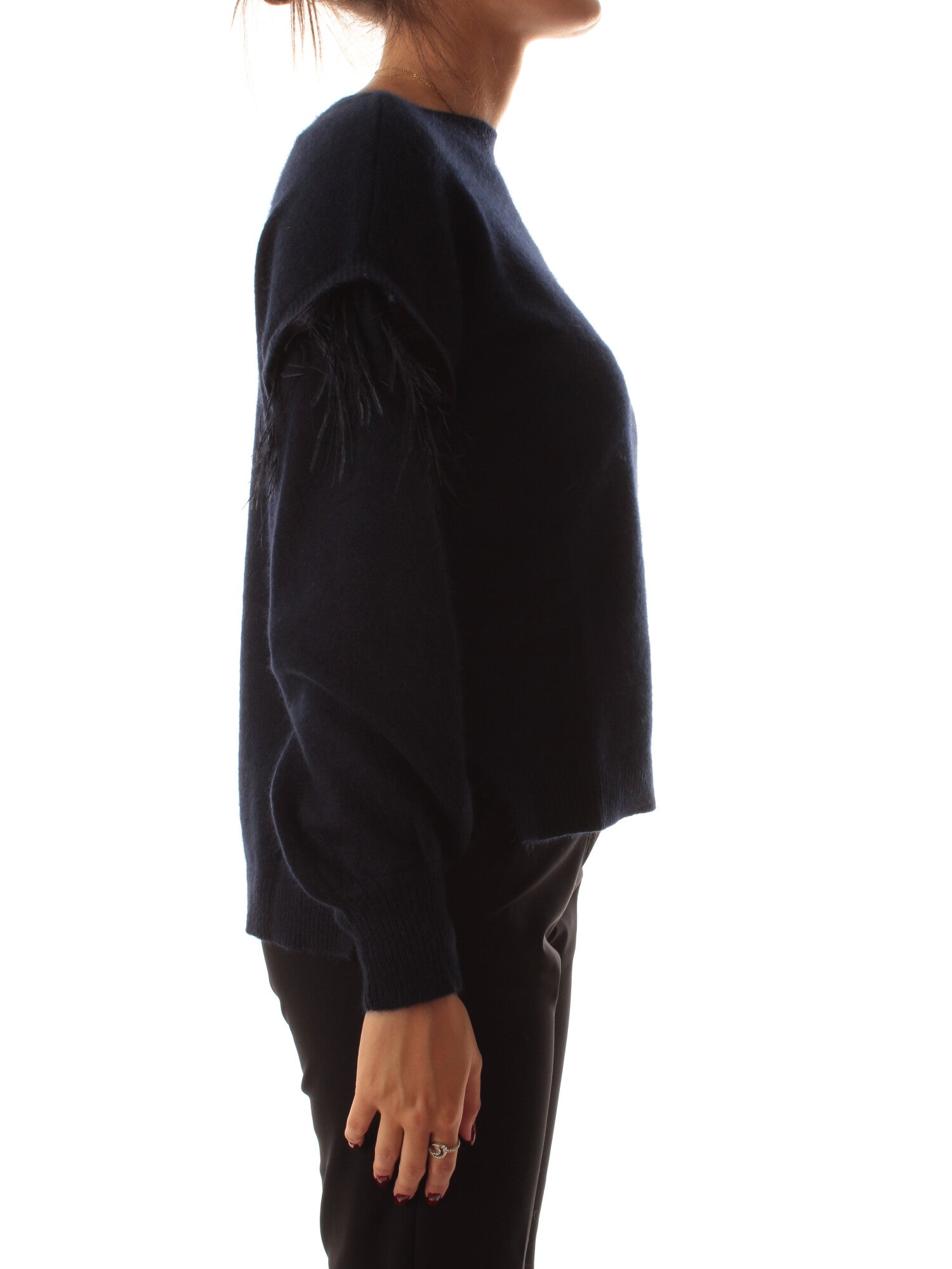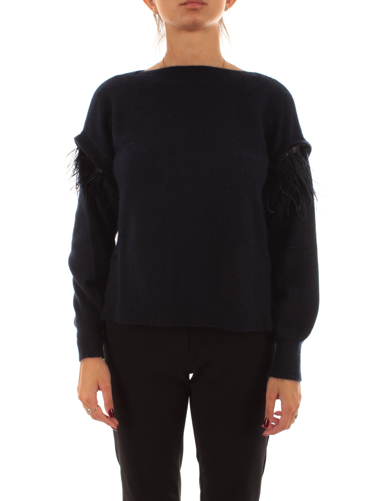 Maglia impreziosita da inserti con piume rimovibili tramite clip sul giromanica. Manica lunga e profili a costine. Fondo asimmetrico: più lungo sul retro. Altezza modella: 172 cm. Taglia indossata: S. 70% poliammide, 30% angora