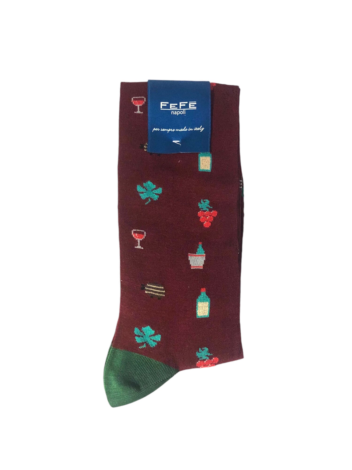 Calze in filo di scozia rimagliate a mano e impreziosite dai ricami dei disegni. Lunghe fino a sotto il ginocchio. Tessuto: 80% cotone, 17% poliestere, 3% elastan.