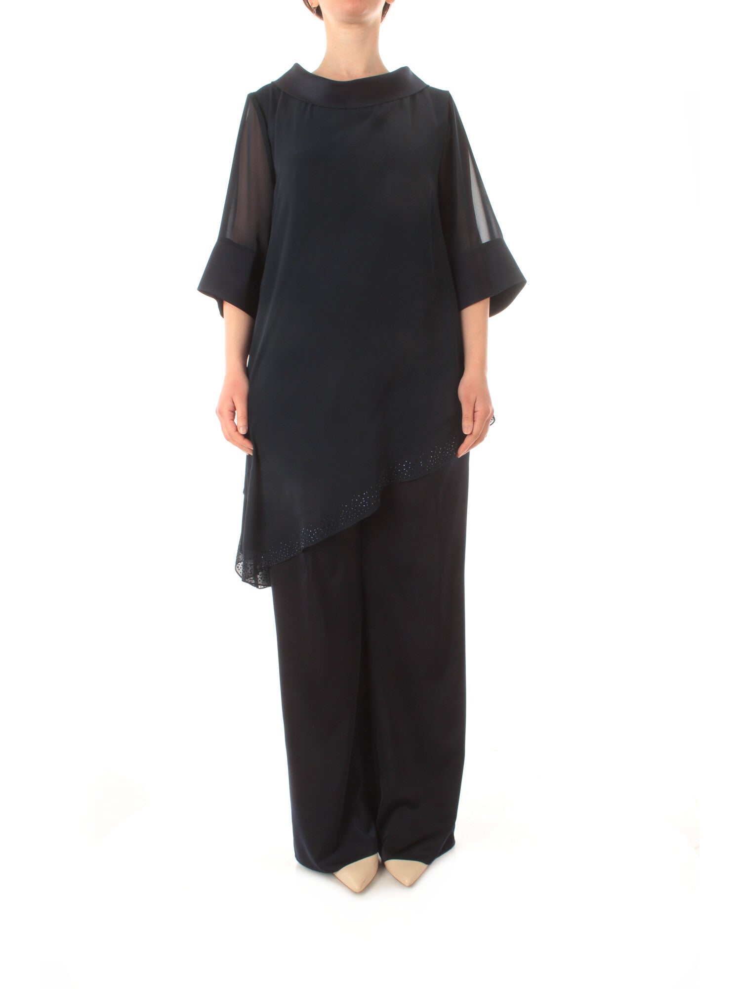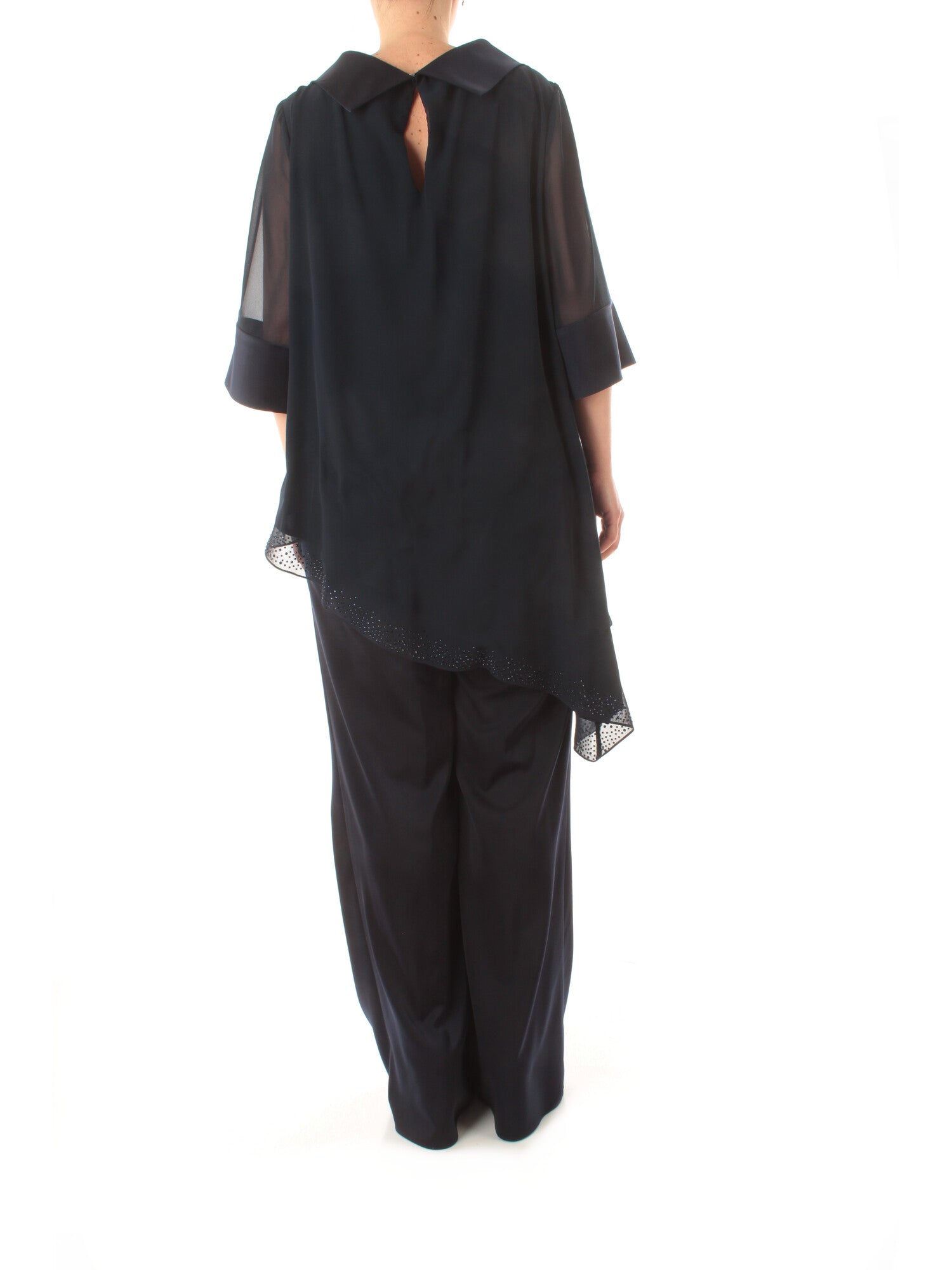 Completo composto da casacca e pantalone in satin. Casacca stile mantella con fondo asimmetrico e applicazioni di strass. Collo a ciambella chiuso con bottone sul retro. Pantaloni wide leg con inserto elastico in vita e chiusura con zip laterale. Altezza modella: 170 cm. Taglia indossata: 46. 100% Poliestere; Fodera: 100% Poliestere