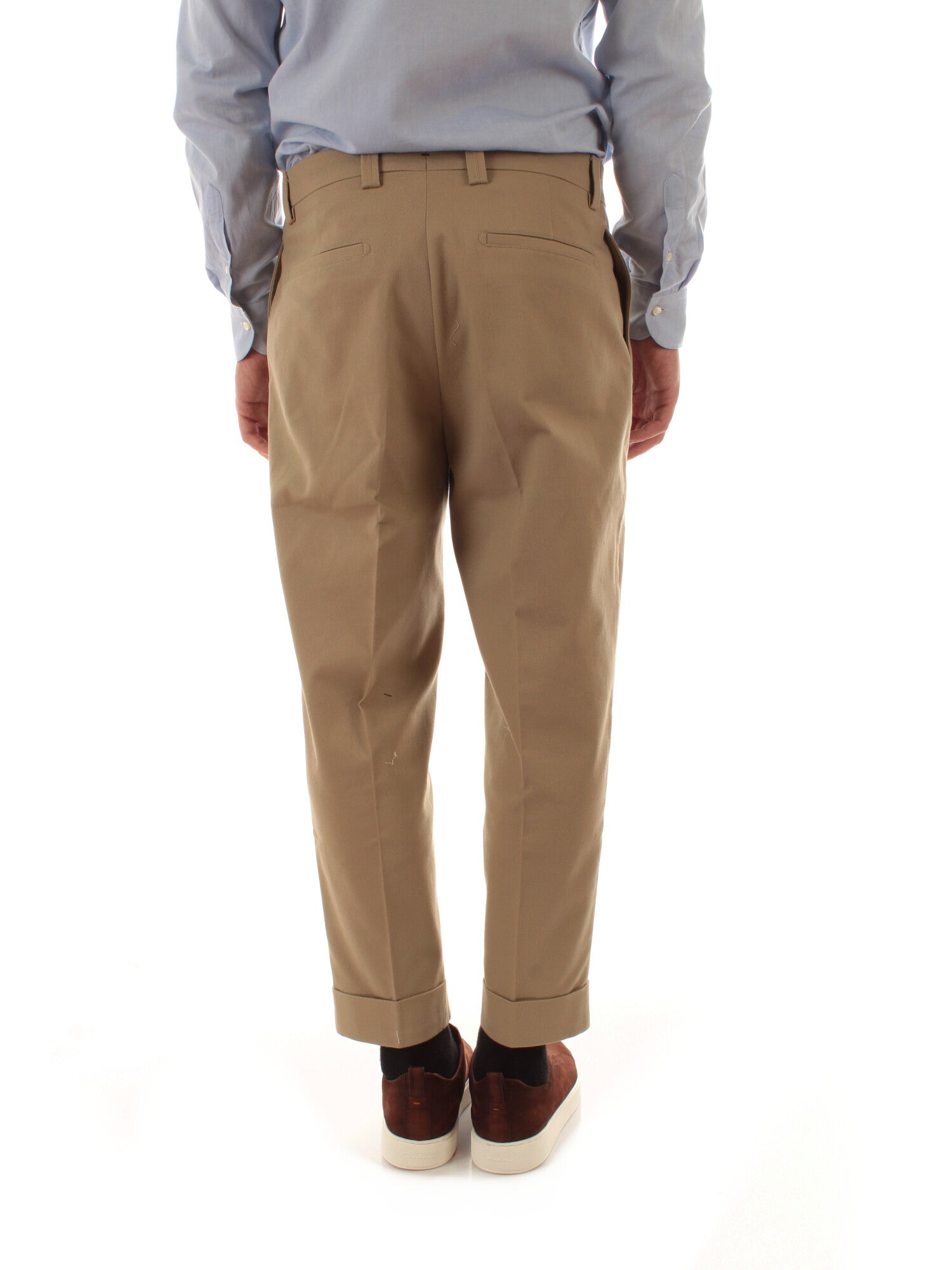 Pantalone chino con tasche a filo e una pence. Fondo con risvolto. Altezza modello: 185 cm. Taglia indossata: 48. 97% cotone, 3% elastan