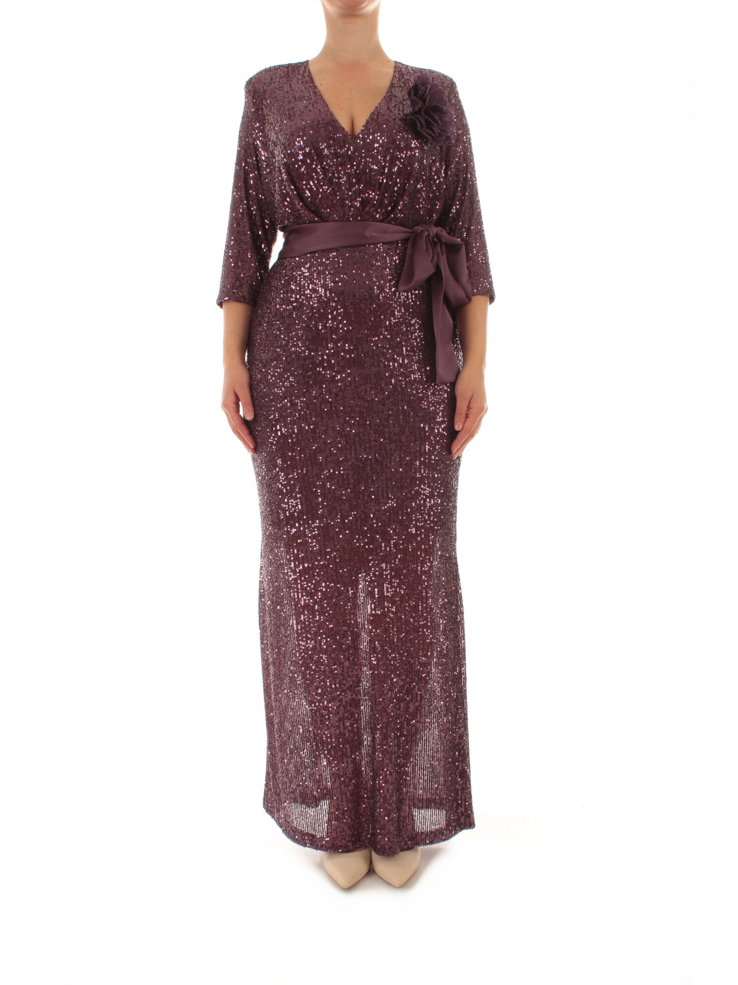 Abito lungo in full paillettes con fusciacca in raso e spilla a fiore removibili. Scollo a V e maniche a tre quarti. Foderato. Altezza modella: 170 cm. Taglia indossata: 46. 93% poliestere, 7% elastan