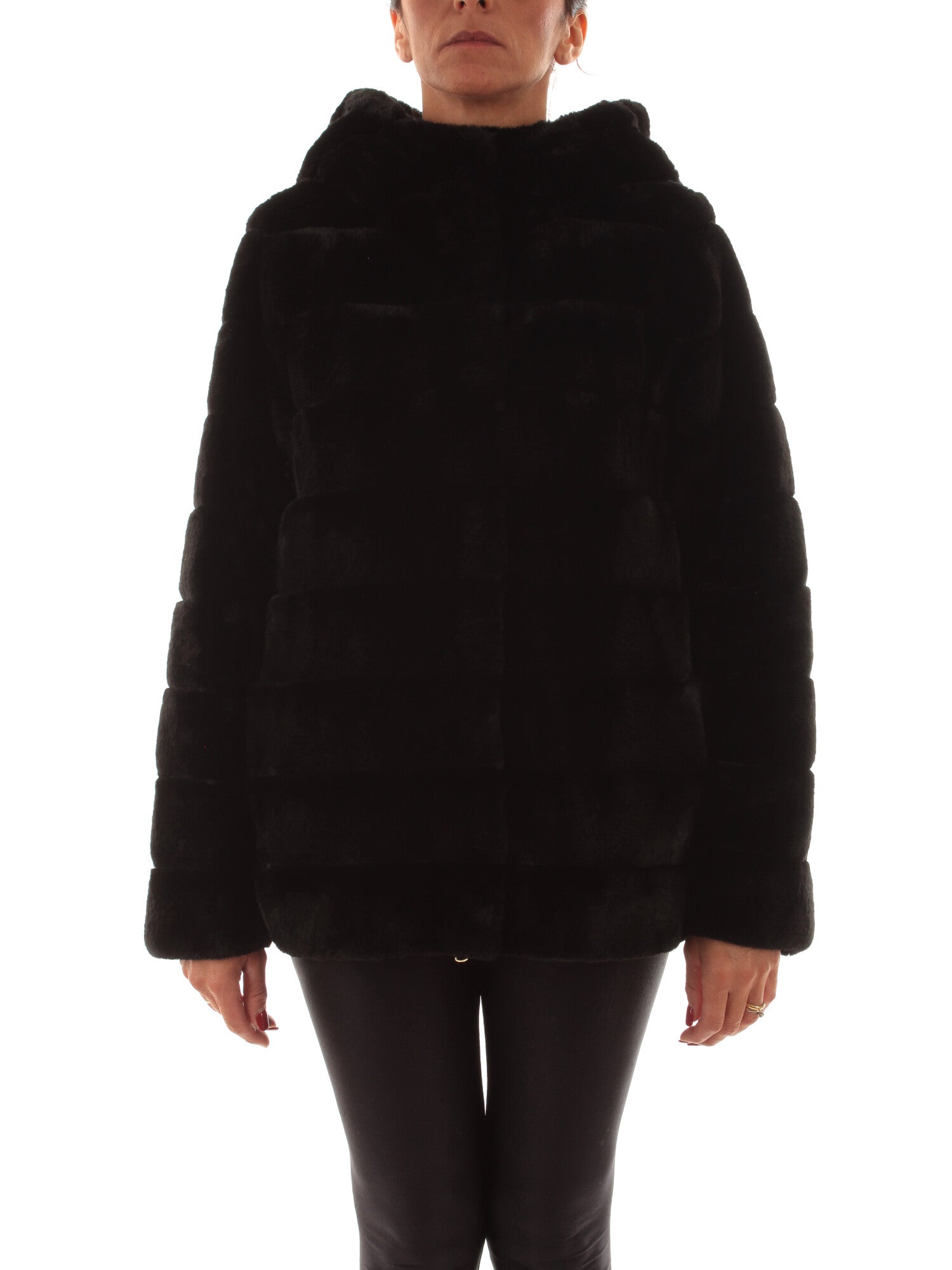 Giacca in tessuto furry. Collo con cappuccio. Chiusura con bottoni a pressione. Tasche laterali a filo. Altezza modella: 172 cm. Taglia indossata: 40. 100% poliestere