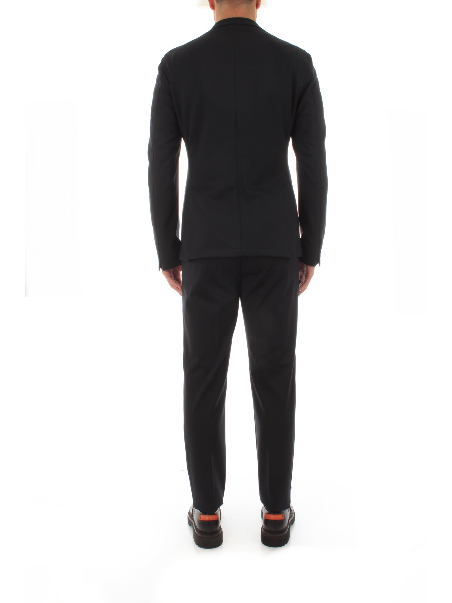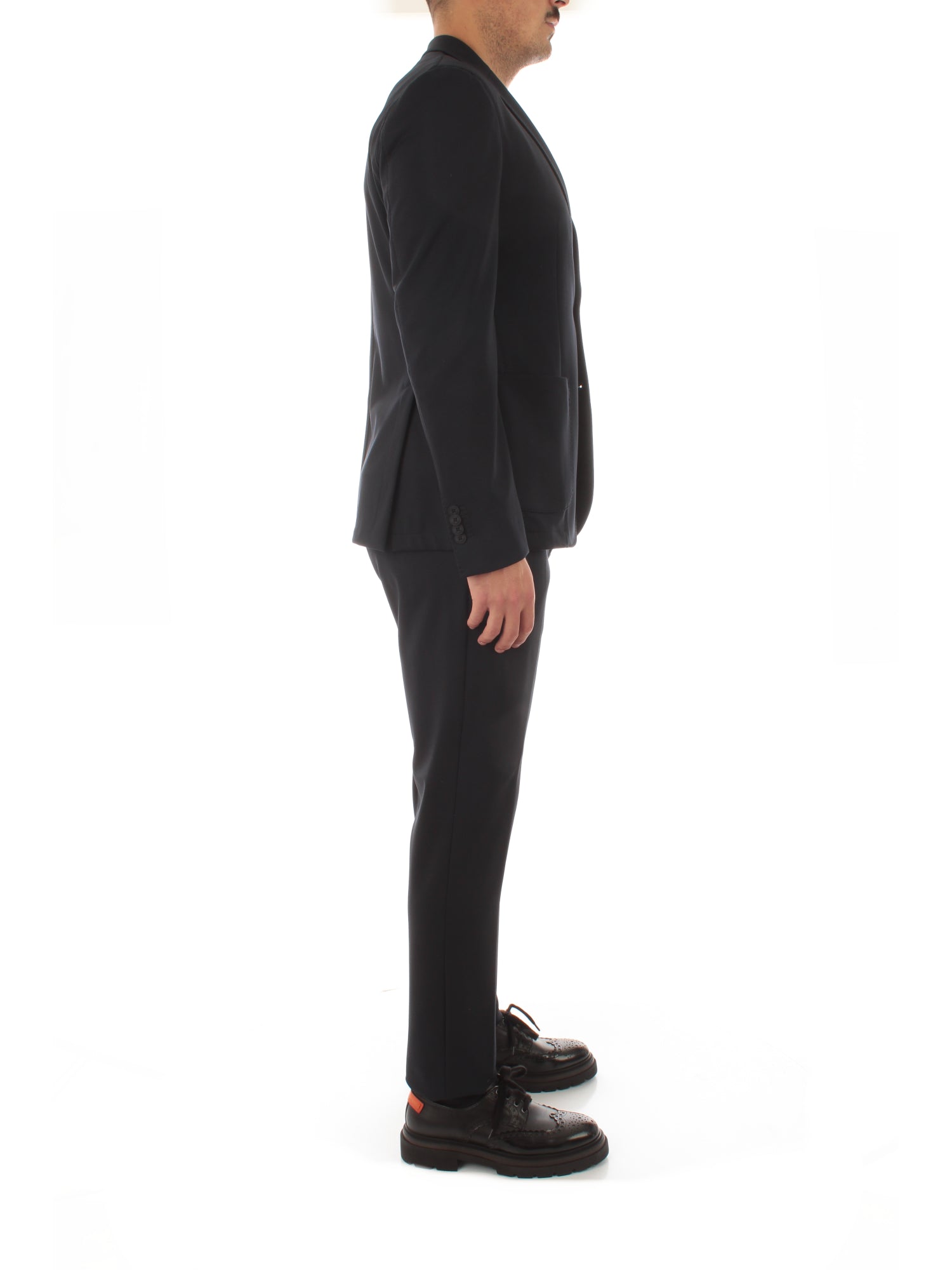 Abito monopetto in tessuto tecnico stretch. Giacca con 2 tasche a toppa, due spacchetti laterali. Pantalone ventre piatto, semivita con elastico. Altezza modello: 190 cm. Taglia indossata: 50. 88% Poliammide, 12% Elastan.
