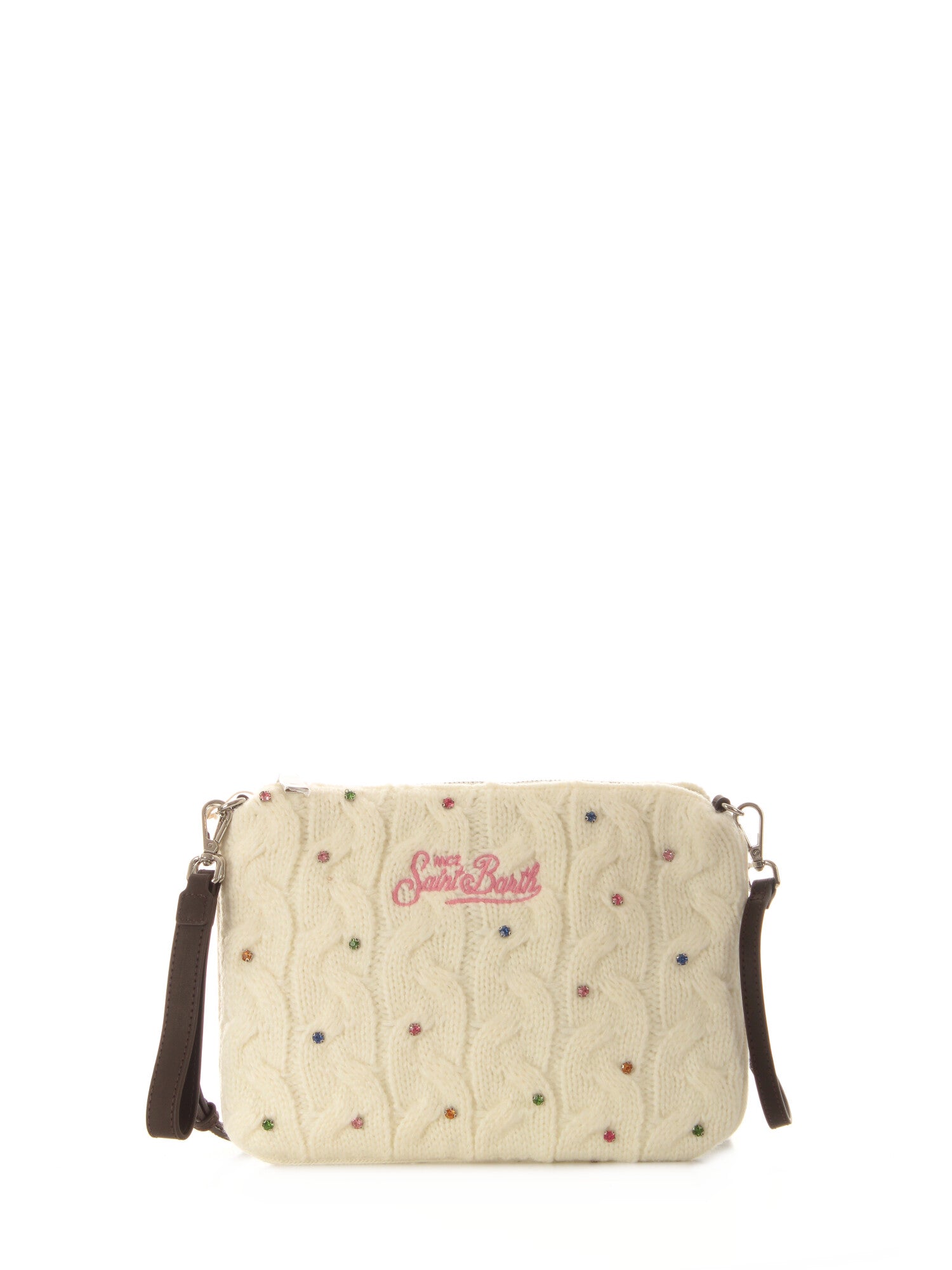 Pochette in maglia di lana con motivo a trecce e applicazione di pietre colorate sul davanti. Logo St.Barth ricamato. Chiusura con zip. Manico singolo e tracolla effetto camoscio staccabili. 20 x 28 cm. 100% acrilica; Fodera: 100% Poliestere