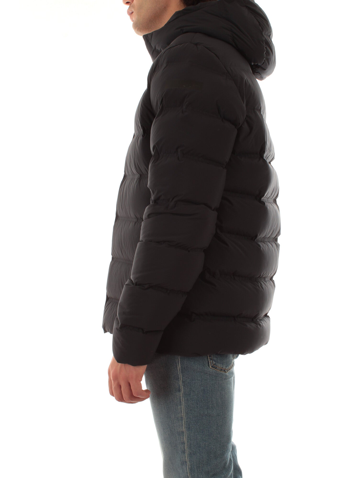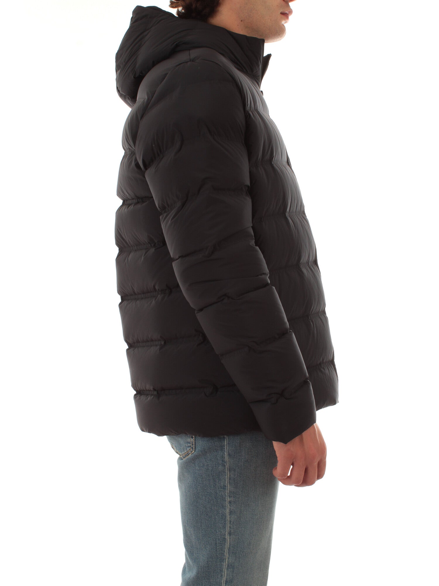 Il piumino di lunghezza media e dal fit regolare è caratterizzato dalla texture senza soluzione di continuità dei canali tubici dal touch morbido e consistente, che contengono l'imbottitura in piuma d'anatra 90/10. La costruzione ad alta densità è rinforzata dalle nastrature interne. Sul davanti, la zip spirale spalmata nera solca il pattern orizzontale del tubico da 10 cm, fino ad assicurare il collo alto e protettivo e il cappuccio avvolgente fisso. Le tasche laterali sono provviste di zip invisibile, mentre l'interno è dotato di un taschino con zip invisibile, impreziosito dal doppio filetto arancione e dalla tag a cuore "Made with love, designed in Tuscany". Altezza modello: 185 cm. Taglia indossata: 48. 100% poliestere