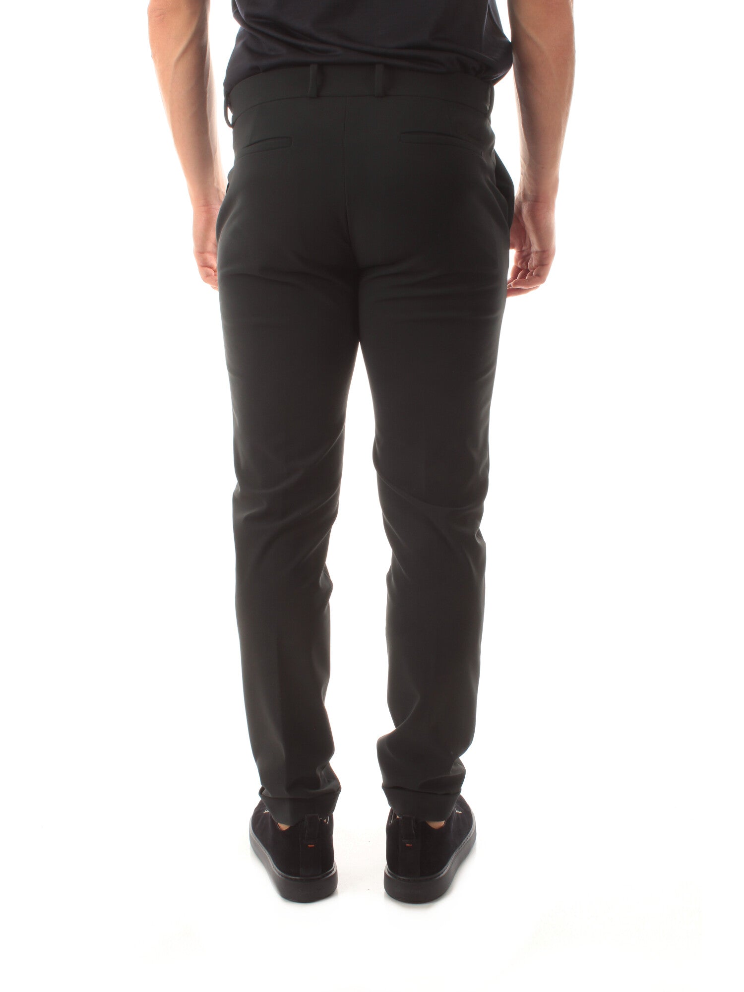 Pantalone dall'effetto super opaco dell'esclusivo tessuto stretch SURFLEX®, liscio e morbido al tatto. Le sue qualità antipiega e no stiro si aggiungono al comfort del fit regolare. Il modello presenta la cintura a passanti regolazione a doppio bottone in corno e la chiusura sul davanti a zip nascosta dalla pattina. Tasche laterali alla francese e il fondo risvoltato, con il logo a microiniezione nero a impreziosire le tasche posteriori a filetto. Altezza modello: 190 cm. Taglia indossata: 48. 79% pa 21% ea