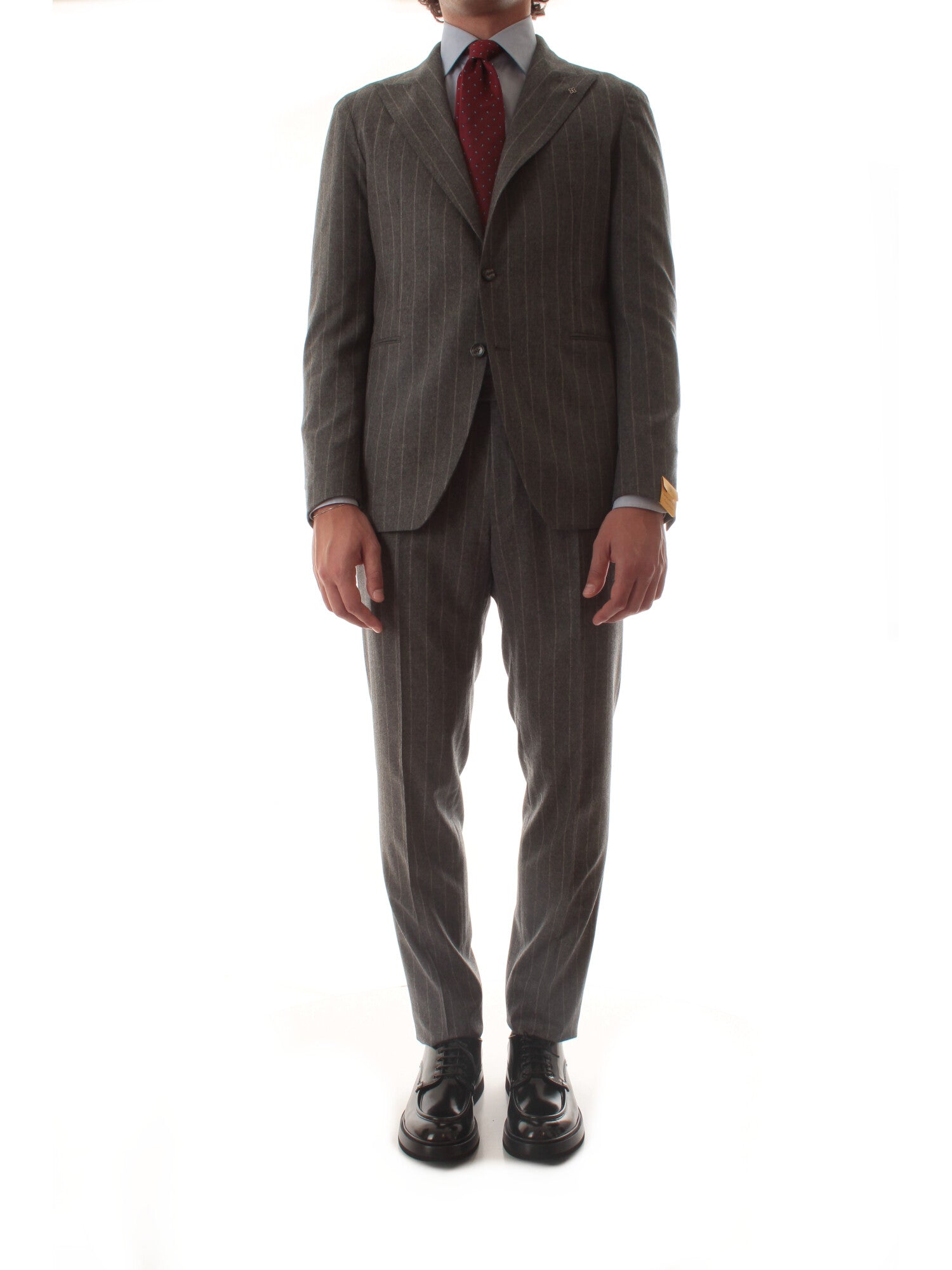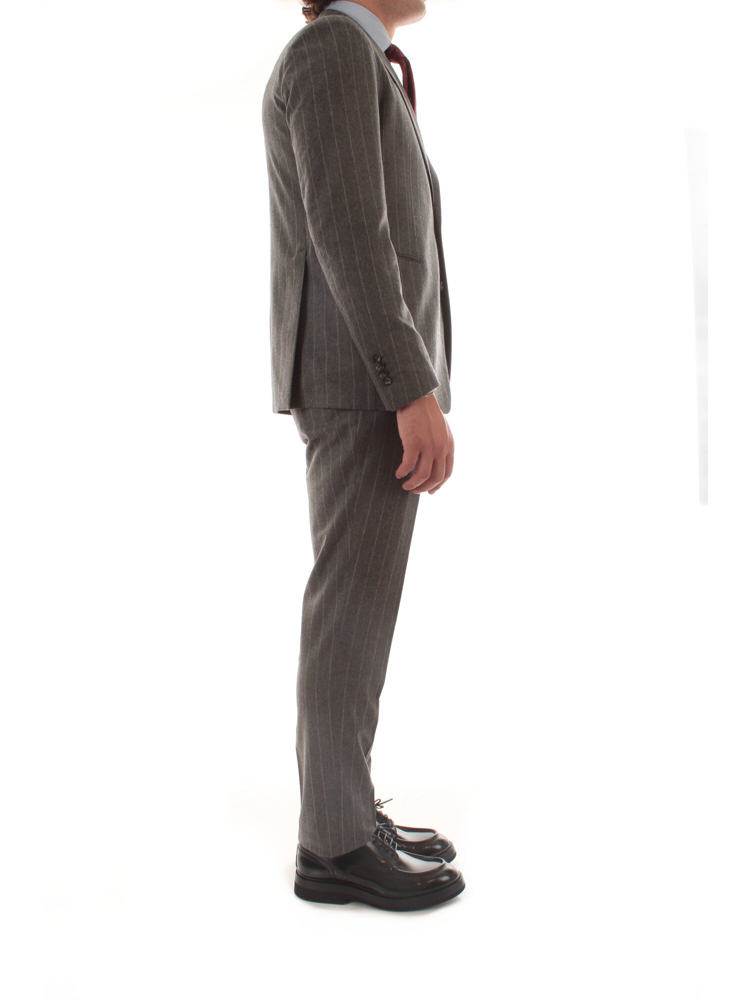 Abito monopetto in tessuto esclusivo gessato. Petto a lancia. Tasche a filo. Spacchi laterali. Pantalone ventre piatto con pence. Altezza modello: 185 cm. Taglia indossata: 50. 90% lana, 5% cashmere, 3% poliammide, 2% elastan