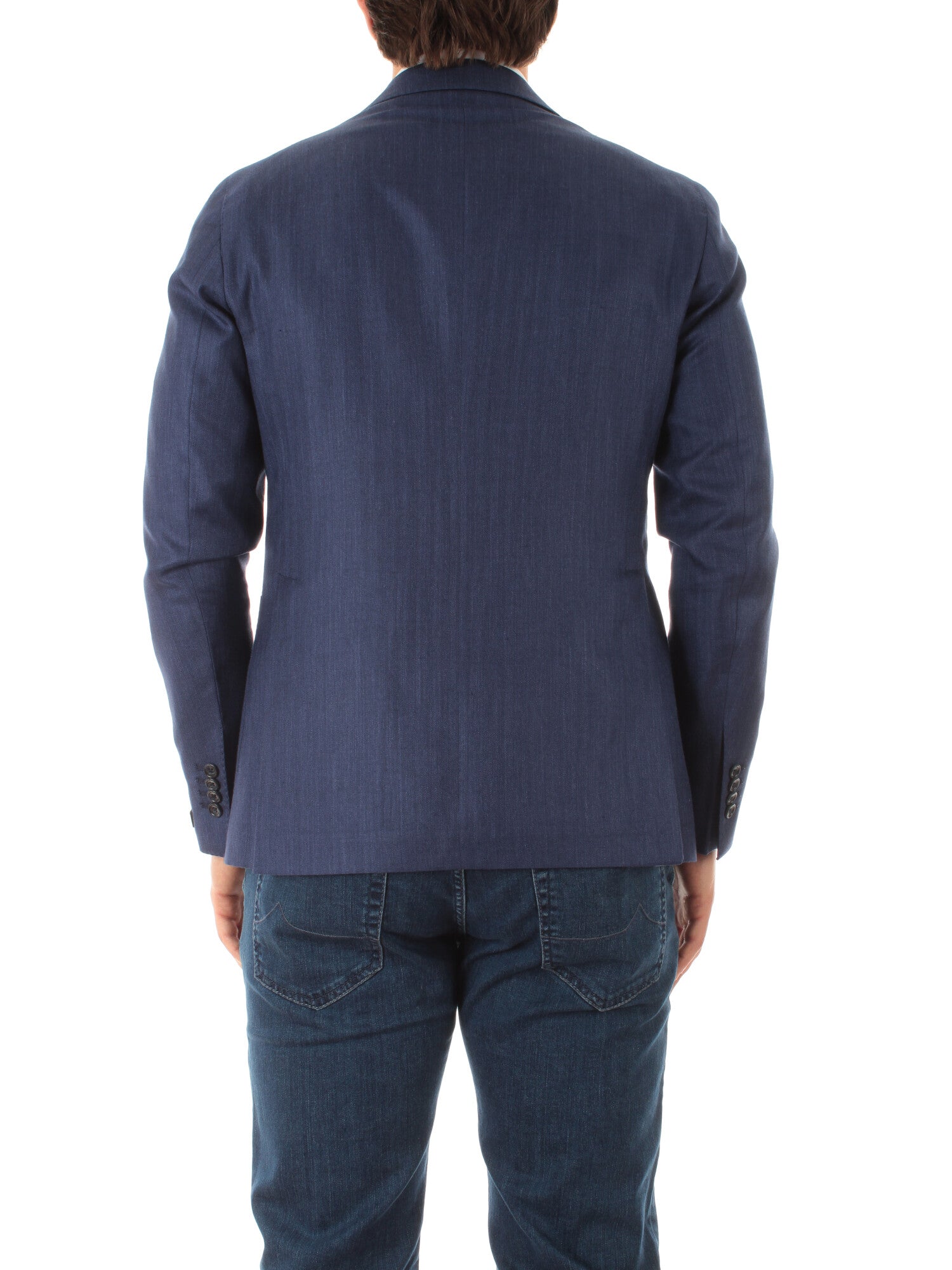 Blazer monopetto, modello due bottoni con rever classico, due tasche a toppa e a filo, spacchi laterali. Semi-foderato. Altezza modello: 185 cm. Taglia indossata: 50. 49% lana vergine, 30% seta, 21% lino