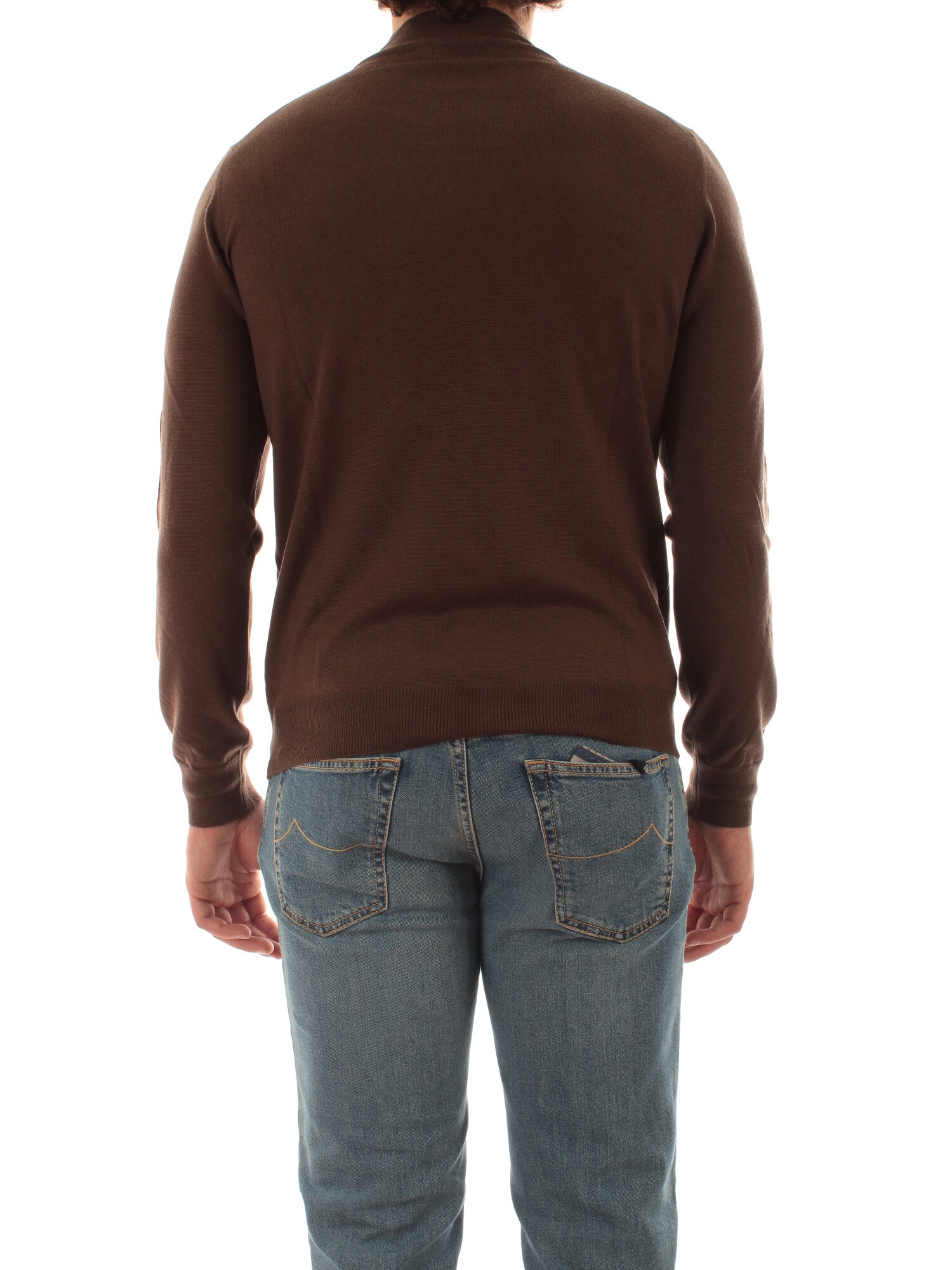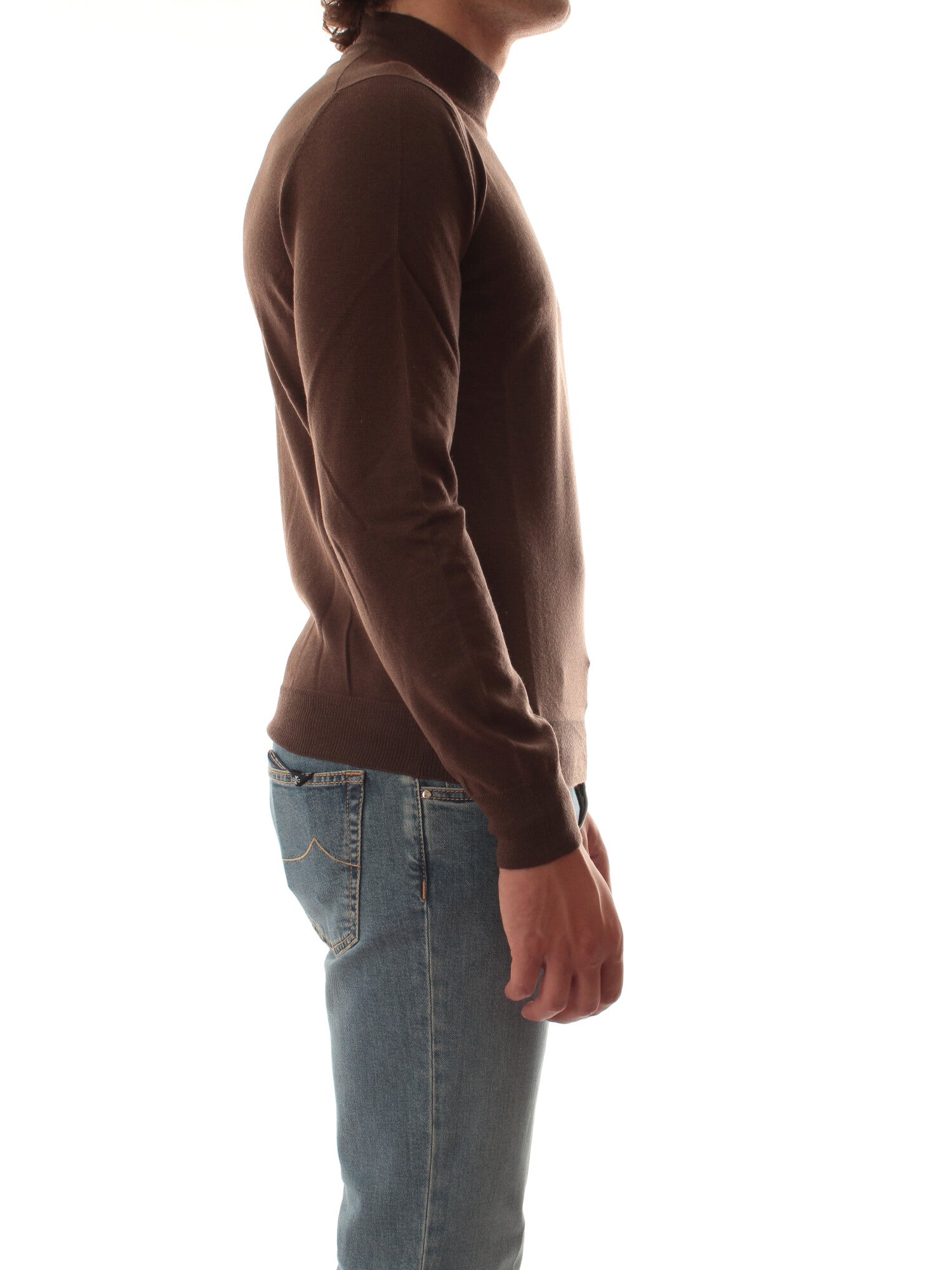 Maglia in pura lana vergine con collo lupetto e manica lunga. Profili a costine. Altezza modello: 185 cm. Taglia indossata: 50. 100% lana vergine