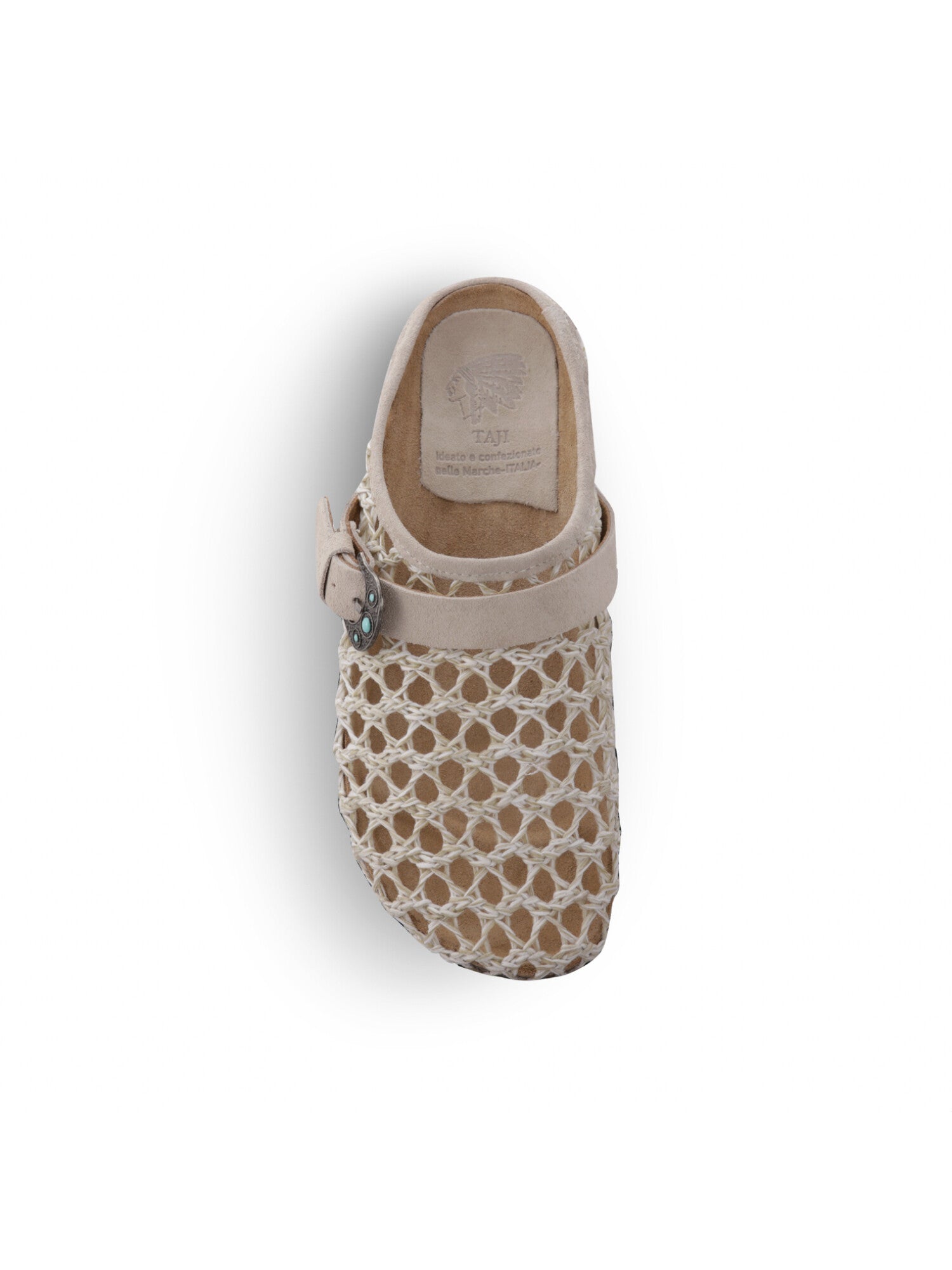 Sabot 1 fibbia con pietre color turchese, suola anatomica foderata in crosta di vitello, tomaia in intreccio color nero.