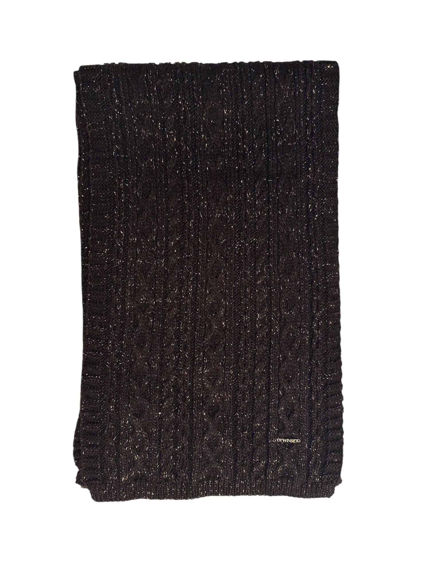 Sciarpa made in Italy in maglia con lavorazione a trecce in filato lurex, placchetta Twinset in metallo color oro. 90x27 cm. 95% acrilica, 5% poliestere metallizzato